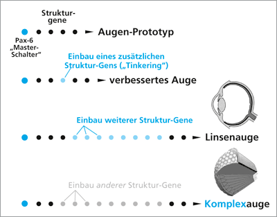 Abb. 2: Stark schematisierte Darstellung des hypothetischen Gen-Tinkerings am Beispiel des Auges. Ein Augen-Prototyp wird zunächst als gegeben vorausgesetzt. Die weitere hypothetische evolutive Entwicklung erfolgt durch sukzessive Einfügung weiterer Gene, die unter der Kontrolle des Master-Gens (pax6) stehen. Die verschiedenen Augentypen sollen demnach durch unterschiedlichen Einbau untergeordneter Gene entstanden sein.
