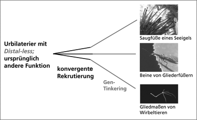Die zweite und die dritte Möglichkeit kann man kombinieren. Entsprechend wird z. B. bei den Gliedmaßen folgendes Szenario diskutiert (Abb. 3): Im hypothetischen Urbilaterier (zweiseitig symmetrischer Vorfahre der Tiere) könnte es sehr einfache Körperanhänge schon gegeben haben (so einfach gebaut, dass die sehr verschiedenen Gliedmaßen der Tierstämme davon abgeleitet werden können). Deren Entwicklung stand bereits unter der Kontrolle eines Steuergens, das dem Steuergen dll („distal-less“), welches bei heutigen Gliedmaßen vorkommt, homolog ist. Dieses konnte dann für die Steuerung der Bildung der verschiedenen Gliedmaßen rekrutiert werden. Der weitere Ausbau erfolgte dann durch evolutives „Tinkering“, also das „Einflicken“ weiterer Elemente in eine bereits existierende Entwicklungskaskade, wobei in der nachfolgenden Evolution sehr verschiedene Gene eingefügt wurden (Abb. 3; vgl. diesen hypothetischen Vorgang bei der Augenevolution in Abb. 2).
