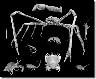 Die Krebstiere (Crustacea) stellen einen Unterstamm innerhalb des Stammes der Gliederfüßer (Arthropoda) dar. Martin & Davis (2001, 1) geben den Artenreichtum dieser Tiergruppe mit ungefähr 52 000 Spezies an (vgl. Land 1996; Monod & Laubier 1996). Die Diversität der Crustaceen wird deutlich, wenn man die enorme morphologische Spannbreite bedenkt, die zwischen den größten und den kleinsten lebenden Vertretern liegt: Die Japanische Riesenkrabbe (Macrocheira kaempferi) misst 3,7 m von Beinspitze zu Beinspitze und der Amerikanische Hummer (Homarus americanus) kann bis zu 20 kg auf die Waage bringen. Auf der anderen Seite erreichen die Wasserflöhe (besonders Alonella) lediglich Körperlängen von oft nicht einmal 0,25 mm (Anonymus 2008). Einen kleinen Einblick in die Formenvielfalt der Krebstiere bietet Abb. 1. Von den anderen Arthropoden unterscheiden sich die Krebstiere dadurch, dass sie zwei Paar Antennen aufweisen (Campbell & Reece 2006, 798). Alle Krebstiere sind aus Körpersegmenten aufgebaut, die durch ein Kopfsegment und ein Endsegment eingeschlossen sind. Dieser grundlegende Aufbau variiert je nach Krebstieruntergruppe jedoch sehr stark, da die einzelnen Segmente und ihre Anhängsel spezifische Funktionen übernehmen. So können beispielsweise die Spaltbeine als Mundwerkzeuge, Saugnäpfe, Genitalorgane usw. auftreten. Der hypothetische evolutive Prozess der Verschmelzung von Segmenten zu funktionellen Einheiten (Tagmata) wird „Tagmosis“ genannt. In Anlehnung an Cisne (1974) beziehen Adamowicz et al. (2008, 4786) diesen Begriff auch auf die „Differenzierung und Spezialisierung der Gliedmaßen entlang der Körperachse“. Cisne (1974) stellt eine Möglichkeit vor, diesen Grad an Gliedmaßenkomplexität bei den Arthropoden mit Rückgriff auf eine Arbeit von Brillouin (1962) zu quantifizieren.