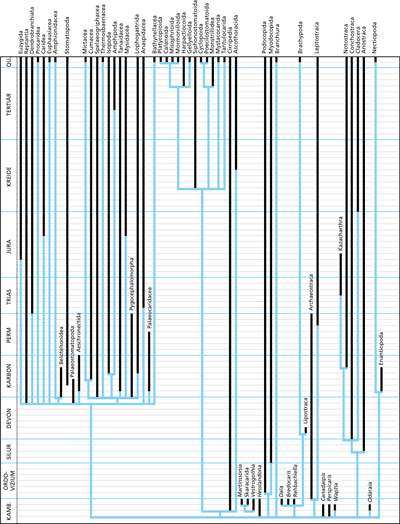 Abb. 2: Mit dem Fossilbericht abgeglichenes Kladogramm für Krebstiertaxa nach Wills (1998, 466). Schwarze Balken sind durch Fossilfunde belegt, blaue Balken (ghost ranges) repräsentieren die Existenz einer Organismengruppe, die aufgrund evolutionstheoretischer Überlegungen postuliert wird, aber fossil nicht belegt ist. Diesem Verfahren liegt die Überlegung zugrunde, dass im Kladogramm identifizierte Schwestertaxa gleichzeitig entstehen, also beide mindestens so alt sind, wie der weiter zurück überlieferte. Das erst später auftauchende Taxon muss in der Zeitspanne, die zwischen den beiden Auftauchdaten liegt, in geologisch nicht überlieferten Lebensräumen gelebt haben.