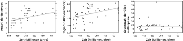 Abb. 3: Regressionsanalyse der Gliedmaßendiversität über das Phanerozoikum hinweg unter verschiedenen Gesichtspunkten (nach Adamowicz et al. 2008, 4787). Zugrunde liegen die jeweiligen Daten des erstmaligen fossilen Auftretens von 66 freilebenden Krebstierordnungen. Die Anzahl der verschiedenen Gliedmaßtypen nimmt ebenso zu wie der Brillouinwert. Die Anzahl der Gliedmaßenpaare bleibt konstant.