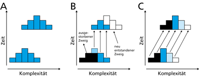 Abb. 4: Wenn innerhalb einer größeren Klade eine Veränderung in eine bestimmte Richtung beobachtet wird (hier: gesteigerte Komplexität; A), kann dies aus evolutionstheoretischer Sicht verschiedene Gründe haben. Wie in B dargestellt könnte sich dieses Bild aus dem zufälligen Aussterben einiger weniger komplexen Untergruppen in Kombination mit der Entstehung einiger komplexerer Gruppen ergeben. Von einem eigentlichen Trendkann hierbei nicht gesprochen werden, da sich innerhalb der Abstammungslinien (zwischen den grauen Kästchen in B) keine Komplexitätszunahme abzeichnet. Ein realer evolutionärer Trend liegt nur vor, wenn (wie in C dargestellt) es zu einem parallelen Komplexitätsgewinn in mehreren Unterabstammungslinien kommt. (Nach Adamowicz et al. 2008)