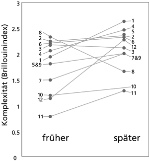 Abb. 5: Komplexitätsverschiebung (in Anlehnung an Cisne 1974 quantifiziert) zwischen 12 Paaren fossiler und rezenter Krebstierordnungen jeweils derselben Klasse.