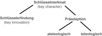 Mit anderen Worten: Die evolutive Neukonstruktion einer Struktur ist in einer bestimmten ökologischen Situation von großer Bedeutung und fördert die weitere Diversifikation der Gruppe, indem sie eine adaptive Radiation ermöglicht (vgl. Bond & Opell 1998). Die „key innovation“ ist in der Regel bereits mit einer evolutiv-phylogenetischen Interpretation belegt. Es wird damit nicht nur ein Merkmal bezeichnet, das eine gewisse funktionelle Bedeutung für die weitere Diversifikation einer Organismengruppe hat, sondern auch ausgesagt, dass dieses in eine vorangegangene Evolutionsgeschichte eingebunden ist. So definieren Heard & Hauser (1995) die „key innovation“ als „eine evolutive Veränderung in einem individuellen Merkmal oder individuellen Merkmalen, welche ursächlich mit einer gesteigerten Diversifikationsrate im resultierenden Stamm verbunden ist“. Und Futuyma (2007, 154) wird noch deutlicher, wenn er von einer „Schlüsselanpassung“ („key adaption“) spricht. Diese sei „eine Anpassung, welche es einem Organismus erlaubt, eine völlig neue ökologische Nische zu besetzen“ (ähnlich Miller 1949; van Valen 1971; Baum & Larson 1991; Rosenzweig & McCord 1991). In diesem Sinn bietet es sich an, im Deutschen von einer „Schlüsselneuheit“ zu sprechen.