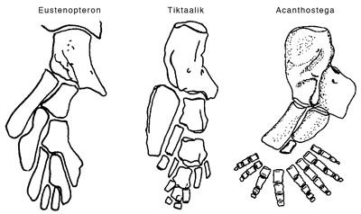 Abb. 2: Vorderextremitäten von Eusthen-opteron, Tiktaalik und Acanthostega. Demnach kann Tiktaalik grob zwischen die beiden anderen Gattungen gestellt werden. Aufgrund anderer Merkmale müsste Acanthostega jedoch zwischen Eusthenopteron und Tiktaalik gestellt werden; siehe Text. (Nach Shubin et al. 2006 und Clack 2002)
