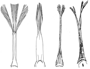 Abb. 2: Gefranste Zungen zweier Meliphagiden (a, b) und zweier Moho-Arten (c, d). Nach den hier vorgestellten molekularen Untersuchungen muss diese spezielle Form der Zunge konvergent entstanden sein. a Meliphaga fasciogularis, b Myzomela sclateri, c Moho nobilis, d Moho braccatus. (Nach Fleischer et al. 2008)