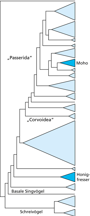 Abb. 3: Schematisches Cladogramm aus 190 Sequenzen von bis zu 1544 Basenpaaren des RAG-1-Gens der Singvogelgruppen. Es zeigt, dass die Gattung Moho genetisch nicht näher mit den Honigfressern verwandt ist (farblich jeweils hervorgehoben). (Stark vereinfacht nach Fleischer et al. 2008)