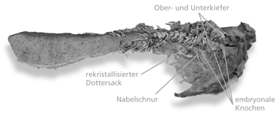 Dieser guten Erhaltung ist es zu verdanken, dass das im Bauchraum des erwachsenen Fisches identifizierte Fischfossil anhand morphologischer Kriterien als Vertreter derselben Art ausgewiesen werden konnte. Bei schlechterer Erhaltung wäre der überraschende Fund wohl als relativ triviales Fossil untergegangen – so wird Long von Dennis (2008, 575) zitiert: „Wenn man einen kleinen Fisch im Inneren eines großen Fisches findet, tendiert man dazu, zu denken, er war eine Mahlzeit […].“ Dass es sich bei dem gefundenen Jungfisch um einen Embryo und nicht etwa um Beute handelt, lässt sich daraus ableiten, dass seine zierlichen Knochen keine Anzeichen einer Beschädigung zu Lebzeiten aufweisen, wie es im Falle eines Verzehrs und der einsetzenden Verdauung durch das erwachsene Tier zu erwarten wäre. Weitere Indizien ergeben sich aus der Lage der Knochen des Jungtiers im Fossil des erwachsenen Fisches: Der Position nach zu urteilen sind diese im Uterus und nicht im Magen gelegen. Auch mineralisiertes Weichgewebe, welches eine Verbindung zwischen hypothetischem Muttertier und Embryo herstellt und als Nabelschnur interpretiert wird, unterstützt diese These, ebenso wie eine als Dottersack zu interpretierende Struktur (Abb. 2).