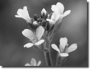 Abb. 1: Blüten der Acker-Schmalwand (Arabidopsis thaliana) (GNU Freie Dokumentationslizenz)