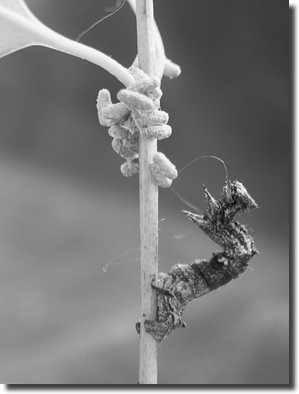 Grosman et al. (2008)1 legen nun eine Studie vor, in der sie in Feldbeobachtungen und Laborexperimenten zeigen, dass die Larven der Brackwespe Glyptapanteles sp. Raupen des Schmetterlings Thyrinteina leucocerae zu ihrer Verteidigung manipulieren. T. leucocerae gehört zu den Spannern (Geometridae). Ein Weibchen der Brackwespe legt bis zu 80 Eier in einer Schmetterlingsraupe ab. Diese entwickeln sich dort und im 4. oder 5. Larvenstadium bohren sie sich aus dem Wirt heraus. Sie verpuppen sich in unmittelbarer Nähe zum verlassenen Wirt, der seinerseits auffällige Veränderungen in seinem Verhalten zeigt. Die parasitierte Schmetterlingsraupe stellt nach dem Ausstieg der Parasiten die Nahrungsaufnahme und die Fortbewegung fast vollkommen ein. Typischerweise fixiert sie sich an Zweigchen mit ihren beiden Afterbeinpaaren und nimmt eine über die verpuppten Parasiten gebeugte Haltung ein. Alle beobachteten parasitierten Raupen starben, nachdem die Brackwespen aus den Puppen geschlüpft waren, ca. 6 bis 7 Tage nach Verlassen des Wirts.