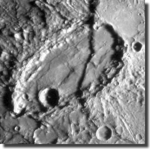 Abb. 1: Der Sveinsdóttir-Krater ist wahrscheinlich durch den Einschlag eines größeren Meteoriten entstanden und besitzt einen Durchmesser von etwa 220 km. Eine etwa 600 km lange Spalte führt mitten durch den Krater. Es wird vermutet, dass diese Spalte durch eine langsame Abkühlung der Merkuroberfläche entstanden ist. (NASA)