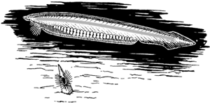 Abb. 1: Das etwa 8 cm lange Lanzettfischchen Amphioxus. Die Chorda ist ein elastischer Stützstab oberhalb des Darms, der auch in der Embryonalentwicklung der Wirbeltiere als erstes Stützorgan gebildet wird. Das glashelle Lanzettfischchen lebt im Sand der Meeresküsten (unten). (Nach Portmann 1976)