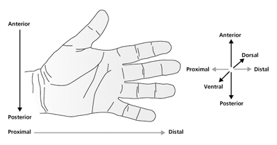 Abb. 1: Die drei anatomischen Achsen zur Beschreibung der Lageverhältnisse von Strukturen der menschlichen Hand. Genau abgestimmte Entwicklungsprozesse der Embryonalentwicklung garantieren, dass der Daumen bzw. der kleine Finger immer am richtigen Ort entstehen. (Nach Tickle 2006)