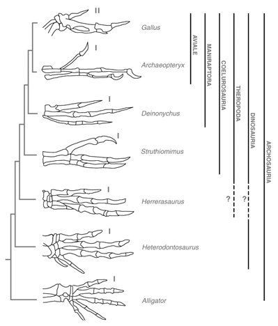 Die Mehrheit der Forscher favorisiert auf der Basis cladistischer Analysen die Hypothese, dass die Vögel sich aus einer Untergruppe der Theropoden-Dinosaurier phylogenetisch herleiten. Zur wichtigsten Stütze für diese Vorstellung zählt die Ähnlichkeit der drei bekrallten Finger des Flügels von Archaeopteryx im Vergleich mit der Anatomie bei einigen dreifingrigen Theropoden, die eine Reduktion des IV. und V. Fingers zeigen (z.B. bei Deinonychus, Struthiomimus, Herrerasaurus).