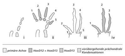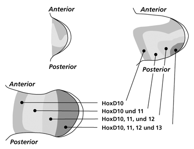 Hox-Gene codieren für Transkriptionsfaktoren, die ihrerseits nachgeschaltete Regulationsgene und Strukturgene beeinflussen, aber auch selbst für Strukturproteine codieren können (Pearson et al. 2005). Diese besonderen Gene sind auf vier Hox-Gen-Cluster bei Vögeln und Säugetieren verteilt (A, B, C, D) und besitzen clusterabhängig eine unterschiedliche Bedeutung für die Extremitätenentwicklung. Die Gene 9-13 der Cluster A und D (HoxA 9-13 und HoxD 9-13) sind unverzichtbar für eine normale Ausprägung der Gliedmaßen, die homologen Gene der Cluster B und C dagegen nicht (Dlugaszewska et al. 2006). Die Vermutung, dass einzelne Hox-Gene für spezifische Strukturen allein verantwortlich sind (also HoxA 10 für Oberarmknochen, HoxA 10 und 11 für Unterarmknochen usw.) hat sich nicht bestätigt. Es existiert kein starres homologes Abbild zwischen den Expressionsmustern der beteiligten Hox-Gene und den morphologischen Entsprechungen der Extremitätenentwicklung. Ein Beispiel: In den einzelnen Phasen der Entwicklung breiten sich wellenartig mehrere, zum Teil reverse (spiegelbildliche) Expressionsmuster des HoxD-Clusters ausgehend von der „ZPA“ über die Extremitätenknospe aus, ohne eine enge Korrelation zu einer bestimmten Achse aufzuweisen (Abb. 6). Das Expressionsmuster der HoxA-Gene zeigt dagegen eine auffällige Anordnung und Ausbreitung entlang der proximo-distalen Achse (HoxA 10, HoxA 11, HoxA 12, HoxA 13), die mit der späteren anatomischen Unterteilung eher zu korrelieren scheint (Abb. 7).