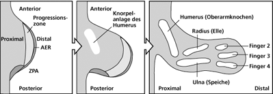 Das heute dominierende „early specification model“ der proximo-distalen Entwicklung der Extremität weist Parallelen zum Morphogen-Gradienten Modell auf (siehe Kastentext 1), welches für die anterio-posteriore Musterbildung der Handentwicklung diskutiert wird.