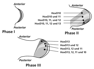 Abb. 6: Schematische Darstellung der HoxD-Gen-Cluster Expressionsmuster in drei aufeinander folgenden Entwicklungsstadien der Extremitätenknospe bei Wirbeltieren. Man beachte den fast spiegelbildlichen Wandel der Expressionsmuster in Phase II und III. Eine Homologisierung von Zellgruppen mit einem speziellen HoxD-Gen-Expressionsmuster mit morphologischen Strukturen ist nicht möglich. Nach www.mun.ca/...; www.nature.com/...