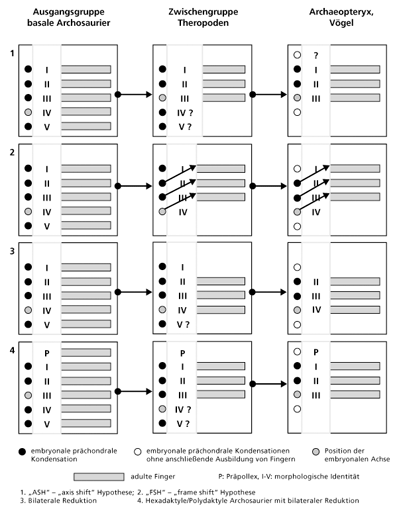 Basale Archosaurier mit der Fingerformel (DI, DII, DIII, DIV, DV) entwickeln sich zu Theropoden mit drei Fingern (DI, DII, DIII) durch Reduktion von CIV, CV und DIV, DV. Damit parallel bzw. in der weiteren Entwicklung in Richtung zu den Vögeln erfolgte ein Versatz der primären embryonalen Achse („axis shift“) von der Fingeranlage CIV auf CIII durch ein anderes „Timing“ im Erscheinen der prächondralen Anlagen (CIII erscheint jetzt als erste Anlage). Die drei Fingerstrahlen der Theropoden und des Vogelflügels sind deshalb homolog zu DI, DII, DIII der übrigen Landwirbeltiere (Abb. 8.1).