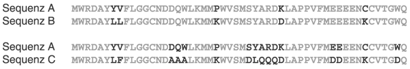 Abb. 1: Exemplarische Darstellung der Ähnlichkeit verschiedener Aminosäure-Sequenzen. Sequenz A wird im ersten Fall mit B und im zweiten Fall mit C verglichen. Gleiche Aminosäuren sind dabei blau dargestellt. Positionen, an denen sich die Aminosäuren der Sequenzen unterscheiden, sind schwarz dargestellt.