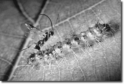 Abb. 1: Ein G. liparidis-Weibchen sticht zur Eiablage mit seinem Legebohrer in eine Schwammspinner-Raupe. Aufnahme: A. Schopf; mit freundlicher Genehmigung Wiley VCH; Biol. in unserer Zeit (2007) 37, S. 291, Abb. 3.
