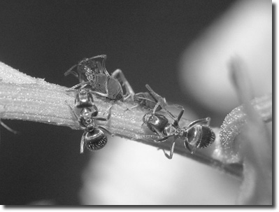 Abb. 2: Schwarze Wegameisen (Lasius niger) beim Melken von Blattläusen. © Bernd Krüger, www.bkmakro.de Abdruck mit freundlicher Genehmigung.