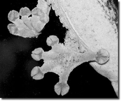 Abb. 1: Setae des Geckos Uroplatus sikorae (sameiti). Die Tiere können dank perfekter Anhaftung, durch ihre mit Billionen feinster Härchen besetzten Füße sogar kopfüber an Scheiben laufen. (Public Domain)