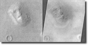 Abb. 1: Artefakt oder natürlich: Das „Marsgesicht“. Links Aufnahme von Viking 1976, rechts in höherer Auflösung aus dem Jahr 2001. (NASA)