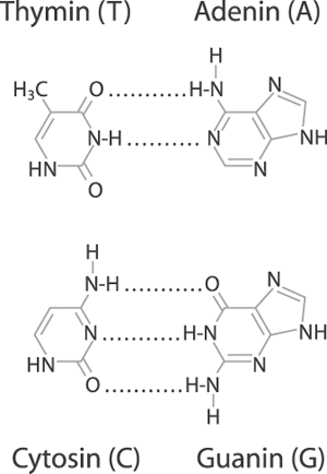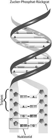 Abb. 1: Aufbau der DNA. Rechts Doppelhelix, Z = Zucker Desoxyribose, P Phosphatrest. Links die vier Grundbausteine (Basen) der DNA. Je zwei Basen passen genau zueinander und sind daher „komplementär“. Die Basenpaarung erfolgt über Wasserstoffbrücken (gepunktete Linien). Mittels der DNA-Sequenz (Abfolge) werden die Reihenfolgen der Aminosäuren in den Proteinen programmiert. Ein Triplett steht für eine Aminosäure. (Aus Junker & Scherer 2006)