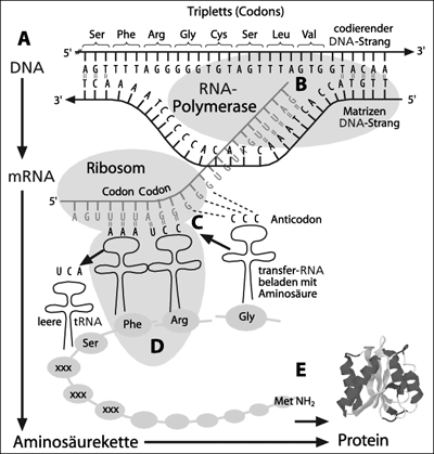 Abb. 2: Vom Gen zum Protein. A Die Erbinformation wird in der Sequenz der DNA-Basen A,T,C und G gespeichert und vererbt (vgl. Abb. 1). Wasserstoffbrückenbindungen sorgen dabei stets für korrekte Basenpaarung. B Ein komplizierter Enzymkomplex (RNA-Polymerase) stellt eine Arbeitskopie des Gens her, welche als messenger-RNA (mRNA) bezeichnet wird (in RNA wird Uracil statt Thymin verwendet). C Eine noch weit kompliziertere molekulare Maschine (Ribosom) ermöglicht, dass aminosäuretragende transfer-RNS-Moleküle an die Basentripletts der mRNS angelagert werden. D Diese Aminosäuren werden am Ribosom zu einer wachsenden Kette verbunden. E Die Aminosäurekette faltet sich, meist unter Mitwirkung von Hilfsproteinen, zum funktionalen Protein zusammen. (Zeichnung nicht maßstabsgetreu; aus Junker & Scherer 2006)