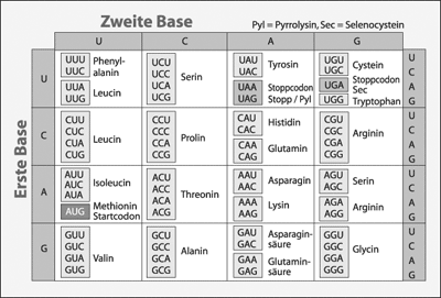 Abb. 3: Der genetische Code in seiner Standardform. Er ist hier auf der mRNA-Ebene angegeben, dort wird statt Thymin die Nukleobase Uracil (U) verwendet. Pyrrolysin und Selenocystein sind selten vorkommende Aminosäuren, die als Bausteine von Proteinen erst in den letzten Jahren entdeckt wurden. (Aus Junker & Scherer 2006)