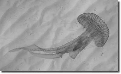 Abb. 4: Zweimal Ordnung: Die Sandrippeln sind zwar formschön, jedoch nur Folge von Strömungsgesetzen. Im Unterschied dazu besitzt die Qualle als lebender Organismus eine ganz andere Qualität von Ordnung: Sie nutzt Gesetzmäßigkeiten aus statt ihnen nur ausgeliefert zu sein, kann auch gegen den Strom schwimmen und besitzt eine zielgerichtete Ordnung. Dieser Unterschied hat fundamentale Folgen für das Verständnis des Lebens. (Foto: Peter Imming)