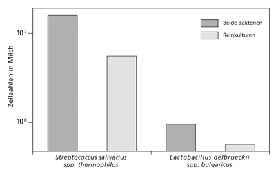 Abb. 1: Metabiose zwischen Streptococcus salivarius spp thermophilus und Lactobacillus delbreuckii spp bulgaricus, den beiden für die Joghurt-Produktion verantwortlichen Milchsäurebakterien. Wenn Milch mit den einzelnen Bakterien beimpft wird, wachsen sie zu deutlich niedrigeren Zellzahlen heran, als wenn beide zusammen in die Milch gegeben werden. Dafür sind vielfältige metabiotische Interaktionen verantwortlich. (Nach Bautista et al. 1966)