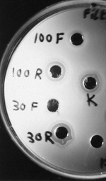 Abb. 2: Antagonismus bei Bakterien. In der Abbildung ist die Wirkung eines Bakteriozins gezeigt. Bakteriozine sind Proteine, die von einem Bakterium ausgeschieden werden und andere Bakterien im Wachstum hemmen. In die ausgestanzten Löcher auf der Agarplatte wurde eine Bakteriozinlösung gefüllt. Die Agarplatte ist mit einem Rasen des Krankheitserregers Listeria monocytogenes bewachsen (trübe Fläche). Rings um Bakteriozin-positive Löcher findet sich eine klare, ringförmige Zone, in die das Bakteriozin hinein diffundierte und das Wachstum des Erregers hemmte. In diesem Experiment handelt es sich um das Bakteriozin Linocin M18, das von dem coryneformen Brevibacterium linens gebildet wird (Valdes-Stauber & Scherer 1994).