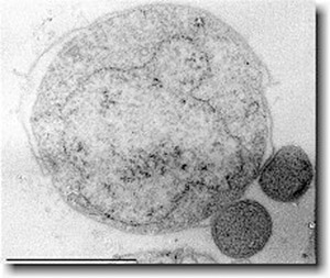 Abb. 3: Das kleinste bekannte Archaebakterium Nanoarchaeum equitans („Reitender Urzwerg“) lebt in obligater Symbiose oder Parasitismus auf anderen Archaebakterien (unten rechts). Sein Genom umfasst nur 490 kb. Es wurde von dem Mikrobiologen Karl O. Stetter entdeckt. Bildrechte: Public domain.