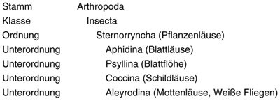 Tab. 1: Systematische Stellung der Pflanzenläuse und ihrer Unterordnungen. In diesem Artikel geht es um die Blattläuse und Blattflöhe.
