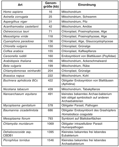 Die DNA von Mitochondrien* von Säugetieren hat mit rund 16 kb nur etwa ein Zehntel der Länge des Genoms von Carsonella. Allerdings existieren auch Mitochondrien mit deutlich längerer DNA – die größten Genome von Pflanzenmitochondrien weisen eine Länge von nahezu 500 kb auf (Tab. 2). Die DNA-Größe von Chloroplasten scheint mit 71-200 kb etwas weniger variabel, allerdings ist die verfügbare Datenbasis deutlich geringer als bei Mitochrondrien.