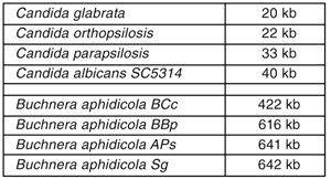 Tab. 3: Verschiedene Arten der Hefegattung Candida und des Blattlaussymbionten (Buchnera) divergieren in der Größe ihrer mitochondrialen DNA. Dieser Variabilität steht die außerordentliche Konstanz der DNA-Größe von Säugetiermitochondrien gegenüber, die so gut wie gar nicht von 16 kb abweicht. Die Gründe für solche Unterschiede sind nicht genau bekannt. Daten aus http://www.bch. umontreal.ca/ogmp/projects/other/all_list.html, Zugriff am 13. 1. 2007