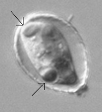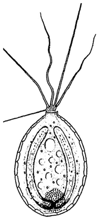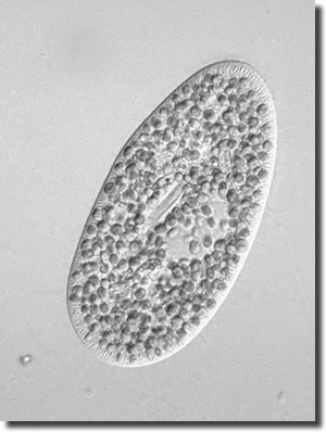 Abb. 8: Dieser Vertreter der Pantoffeltierchen (Paramecium bursaria) ist angefüllt mit Grünalgen der Art Chlorella. Diese versorgen den Wirt mit Photosynheseprodukten, der Wirt scheint für Schutz und Transport des Endosymbionten zu sorgen. Foto: Y. Tsukii, Japan.