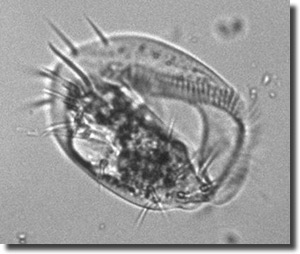 Abb. 7: Euplotes sp. gehört zu den Ciliophora. Der Protist ist etwa zwischen 0,05 und 0,1 mm lang und kann Bakterien als Endosymbionten beherbergen (vgl. Text). Aufnahme: H. Yoshino, Japan.