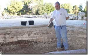 Unten: Profilwand des Grabungsareals D3 in Ramat Rachel (am Südwestrand von Jerusalem). Profilwände geben ein gutes Bild der Siedlungsgeschichte des Ruinenhügels wieder. Der weiße Boden markiert den eisenzeitlichen Fußboden des Palastes aus dem 7. Jh. v. Chr. (Fotos: Peter VAN DER VEEN)