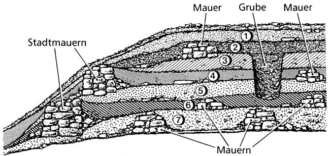 Abb. 2: Schnitt eines archäologischen Ruinenhügels (nach D. VIEWEGER 2003, Abb. 120, mit freundlicher Genehmigung von Herrn BRÜCKELMANN, Brüggen-Born).