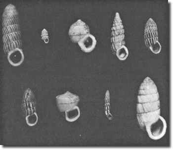 Abb. 1: Verschiedene Cerion-Gehäuse von den Bahamas und Kuba. Sie vermitteln einen Eindruck von der enormen Vielfalt dieser Gattung. Foto: Al Coleman.