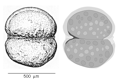 Abb.1: Zeichnerische und graphische Darstellung von Parapandorina aus der Doushantuo-Region Südchinas, nach Fotos aus Donoghue (2006), rechts nach einem Foto mit Röntgen-Mikrotomographie, mit zahlreichen Vakuolen. Eine neue Studie deckte einige Ähnlichkeiten mit Riesenbakterien auf.