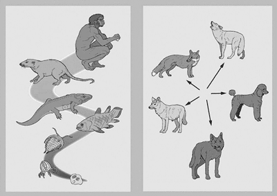 Abb. 1: Mikro- und Makroevolution. Unter Mikroevolution fällt beispielsweise die Entstehung der verschiedenen Hunderassen aus einer Urform, wahrscheinlich dem Wolf, während die Entstehung der Säugetiere aus Reptilien und einfacher organisierten Lebewesen Makroevolution wäre. Im ersten Falle werden nämlich nur bereits vorhandene Strukturen variiert (Eigenschaften des Fells, Form der Schnauze usw.), während im zweiten ganz neue Strukturen gebildet werden müßten: Haare, Milchdrüsen, Einrichtungen für die Temperaturregulation und was sonst die Säugetiere, nicht aber die Reptilien oder andere Vorfahren charakterisiert. Mikroevolution: Wie werden vorhandene Konstruktionen der Lebewesen optimiert?