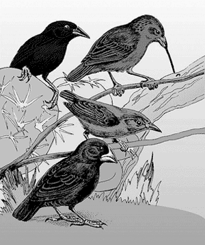 Abb. 2: Mikro-evolutive Variation bei den Schnäbeln und Gefiederfärbungen einiger Darwinfinken. (Aus Junker & Scherer 2006)