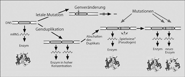 Evolutiver Umbau duplizierter Gene. Eines der Probleme bei der Evolution neuer Eigenschaften besteht darin, daß sich komplexe Systeme „im Betrieb“ nur sehr begrenzt umbauen lassen. Denn der langsame evolutive Übergang von einem Protein zu einem anderen wird in der Regel zu Zwischenformen führen, welche gegenüber der Ausgangsform im selektiven Nachteil sind. Daher wurde folgendes Szenario vorgeschlagen (vgl. Abb. 4): Neue Gene mit neuen Funktionen könnten dadurch entstehen, daß Gene zunächst verdoppelt werden (Genduplikation, ein empirisch nachgewiesener Vorgang) und anschließend das eine von ihnen inaktiviert (und dadurch zum Pseudogen) wird, während das andere seine bisherige Aufgabe weiterhin erfüllt. Auch die Inaktivierung ist ein experimentell nachgewiesener Vorgang. Die inaktive Kopie könnte nun nahezu beliebig umgebaut werden. Sobald der Umbau abgeschlossen ist, kann das Gen wieder angeschaltet werden, und auf einmal scheint ein Evolutionssprung stattzufinden: Viele (vorher akkumulierte) Mutationen werden nun auf einen Schlag wirksam. Wenn sich dieser Vorgang nun vielfach parallel im Genom ereignet, könnte es sogar zu evolutionären Innovationen kommen. Die vorübergehende Inaktivierung ist notwendig, weil das Gen während des Umbaus nicht der Selektion preisgegeben werden darf.