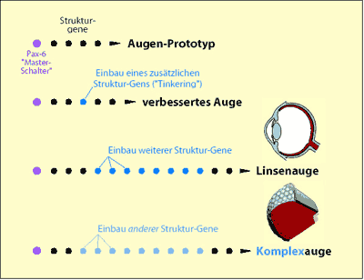 Abb. 5: Stark schematisierte Darstellung des hypothetischen „Gen-Tinkerings“ am Beispiel des Auges. Ein Augen-Prototyp wird zunächst als gegeben vorausgesetzt. Die weitere hypothetische evolutive Entwicklung erfolgt durch sukzessive Einfügung weiterer Gene, die unter der Kontrolle des Master-Gens (Hox-Gen, hier Pax-6) stehen. Die verschiedenen Augentypen sollen demnach durch unterschiedlichen Einbau untergeordneter Gene entstanden sein. Das Hox-Gen bleibt dasselbe und kann daher die Entwicklung verschiedener Augentypen induzieren.