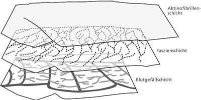 Abb. 2: Gewebetypen des besonders gut erhaltenen Flügels eines Flugsauriers Rhamphorhynchus muensteri aus dem Oberen Jura des Solnhofener Plattenkalks (Südliche Frankenalb), einzelne, übereinander liegende Gewebeschichten. (Nach Tischlinger & Frei 2002)