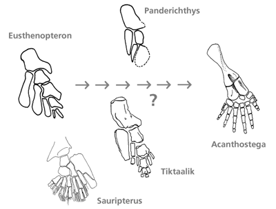 Gattungen wie Acanthostega sind erheblich (Abb. 2). Ahlberg & Clack (2006, 748) weisen darauf hin, daß der Erwerb von Fingern, von Tiktaalik ausgehend, eine erhebliche Umorganisation („developmental repatterning“) erfordern würde. Der achtfingrige oberdevonische Tetrapode Acanthostega war höchstwahrscheinlich ausschließlich wasserlebend; seine Extremitäten waren relativ unbeweglich. Aus diesen Gründen eignet sich diese Gattung nicht als vermittelnde Form zwischen Tiktaalik und landlebenden Tetrapoden. Man kann es so sagen: Tiktaalik hatte deutlich andere „Übergangsmerkmale“ auf dem hypothetischen Weg zum Landleben als Acanthostega. Der Weg aufs Land konnte nicht über beide Formen zugleich führen, es sei denn, er wurde mindestens zweimal unabhängig durchlaufen, womit dann aber die Vierbeinigkeit nicht mehr als Schlüsselmerkmal (d. h. als Hinweis auf gemeinsame Vorfahren) gelten könnte, sondern konvergent entstanden wäre. Schon länger ist klar, daß auch das berühmte Ichthyostega, vor noch nicht langer Zeit die Ikone für den Übergang vom Wasser- zum Landleben, deutlich von einer vermittelnden Position entfernt ist (Clack 2002, Ahlberg et al. 2005; zusammenfassend Junker 2004; 2006).