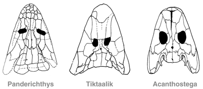 Abb. 3: Schädel von Panderichthys, Tiktaalik und Acanthostega. (Nach Daeschler et al. 2006)